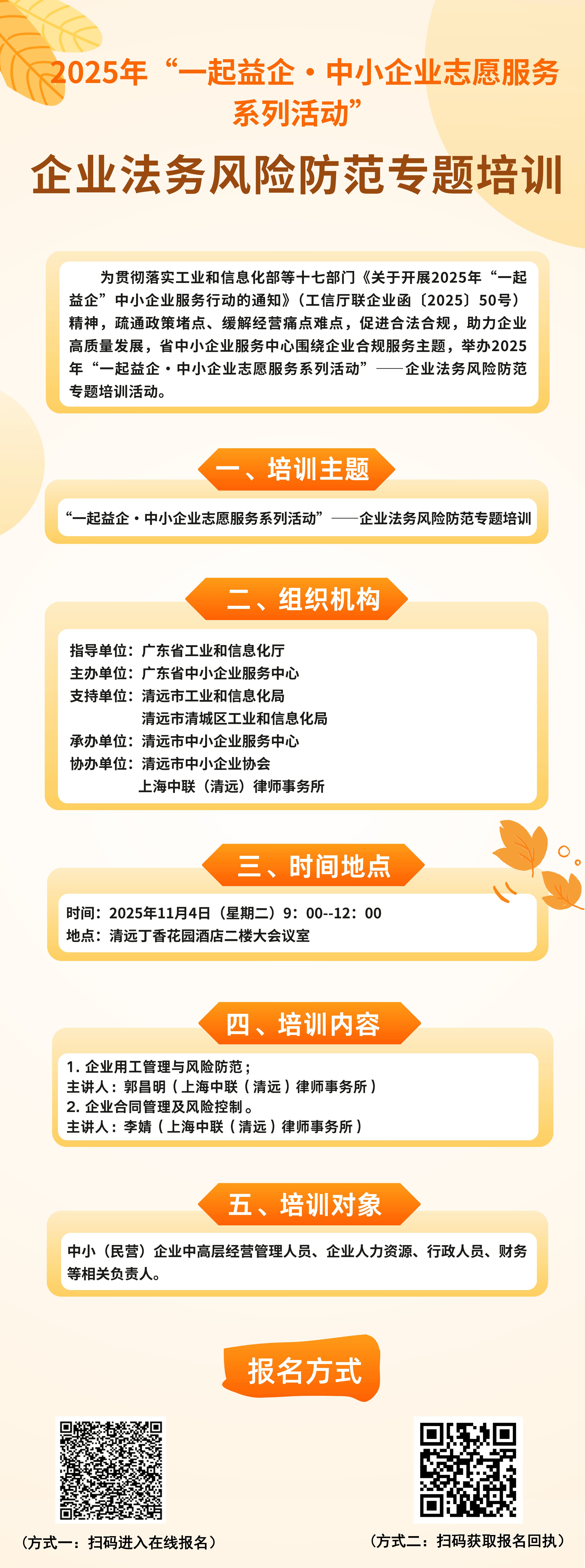 【公益培訓(xùn)】11月4日!2025年“一起益企·中小企業(yè)志愿服務(wù)系列活動(dòng)”——企業(yè)法務(wù)風(fēng)險(xiǎn)防范專題培訓(xùn)誠(chéng)邀您參加~